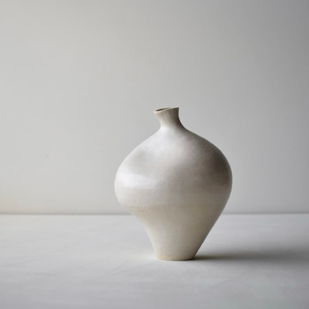 Medium coiled stoneware piece, carrying marks from the hand built process, including any natural imperfections from the making process.